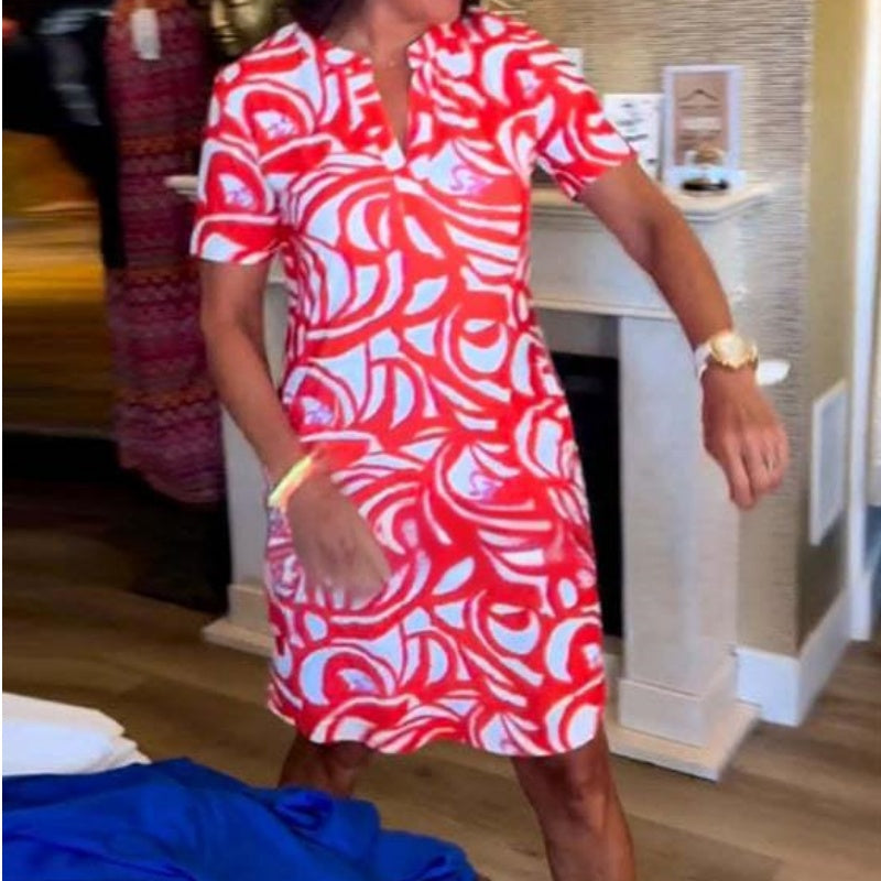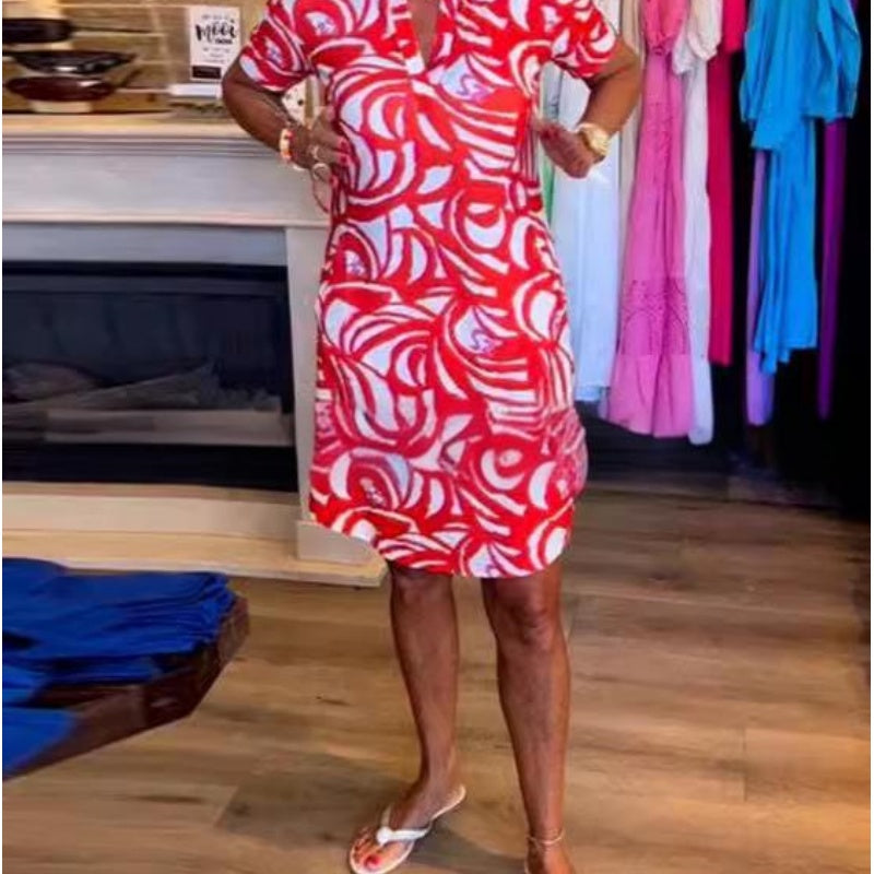 Short-Sleeved Printed V-Neck Fashion Dress