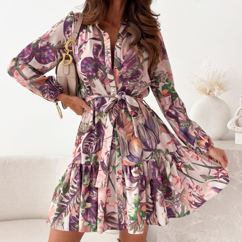 1 x Floral Pattern Waist-Cinching Ruffled Shirt Dress