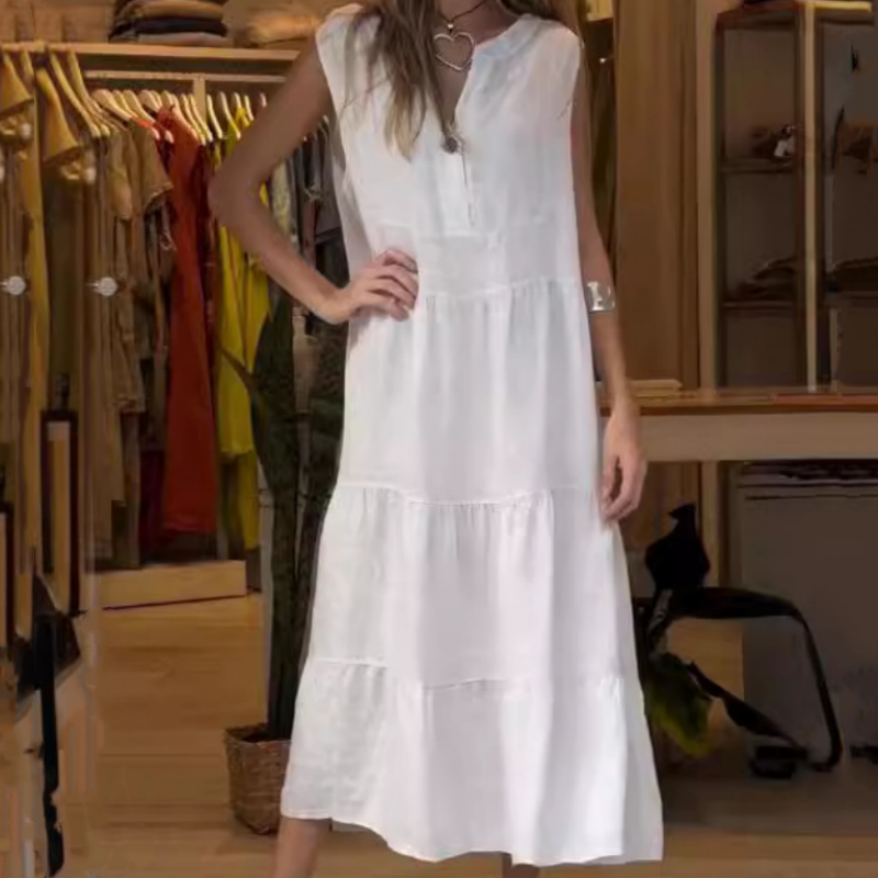 1 * Women's V-Neck Button Sleeveless Tiered Long Dress